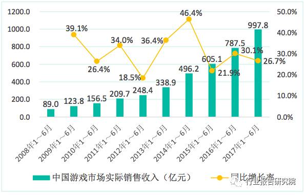 2017 年 1-6 月,中国游戏市场实际销售收入达到 997.8 亿 元,同比增长 26.7%,保持高速增长。