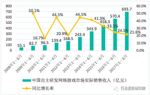 2017 年 1-6 月,中国自主研发网络游戏市场实际销售收入达到 693.7 亿元,同比增长 21.6%。