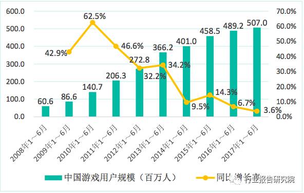 2017 年 1-6 月,中国游戏用户规模 5.07 亿人,同比增长3.6%,增速继续下滑。这表明,中国游戏市场人口红利逐渐消失, 用户规模将逐渐趋于稳定。