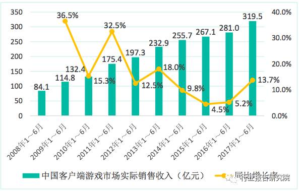 2017 年 1-6 月,客户端游戏市场实际销售收入达到 319.5亿元,同比增长 13.7%。客户端游戏市场实际销售收入增速明显 回升,有利因素是老客户端游戏收入回升、新客户端游戏市场表 现出色。值得注意的是,有利因素的占有考为客户端游戏行业的领军企业。