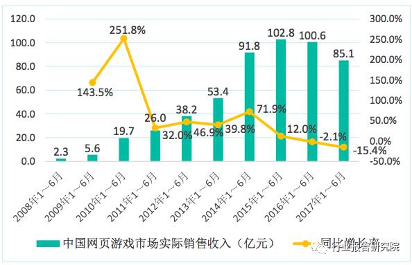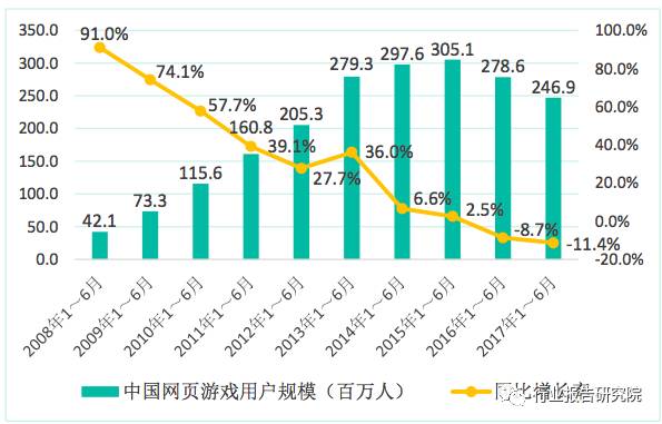 2017 年 1-6 月,网页游戏用户规模 2.47 亿人,同比下降11.4%,连续两年下滑。