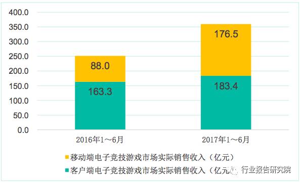 2017 年 1-6 月,电子竞技游戏市场实际销售收入达到 359.9亿元,同比增长 43.2%。客户端电子竞技游戏市场实际销售收入 保持稳定、移动电子竞技游戏取得突破,促成电子竞技游戏市场 进一步增长,例如《王者荣耀》等游戏市场实际销售收入暴增。