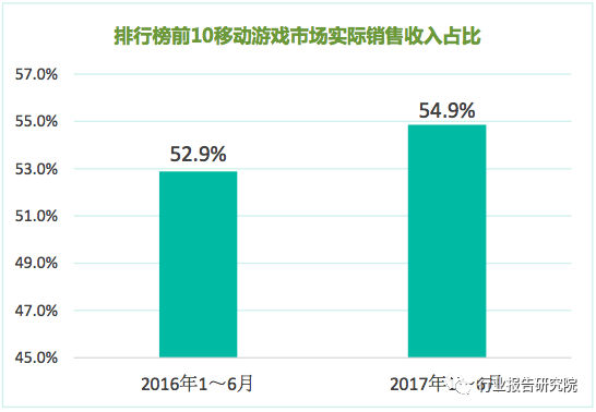 2017 年 1~6 月,排行榜前 10 移动游戏市场实际销售收入占中国移动游戏市场实际销售收入 54.9%,同比多两个百分点, 市场集中度略有加强。