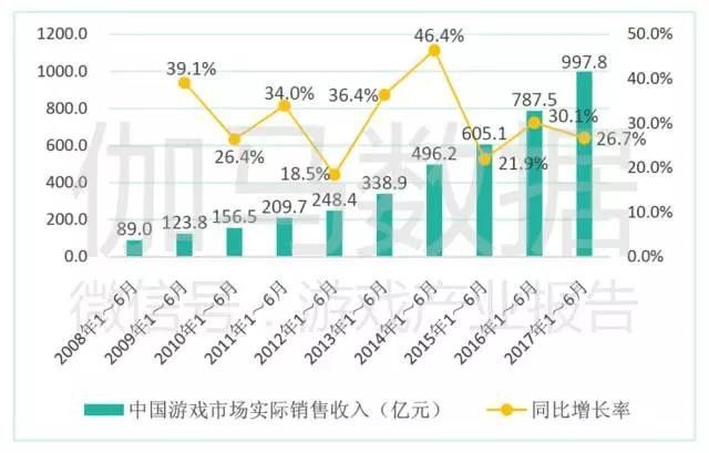 研究显示,中国游戏市场在整体上依然保持着收入的高速增长。2017年上半年,中国游戏市场实际销售收入达到997.8亿元,同比增长26.7%,210.3亿元的收入增量成为自2009年以来所有上半年收入增量中的新高。