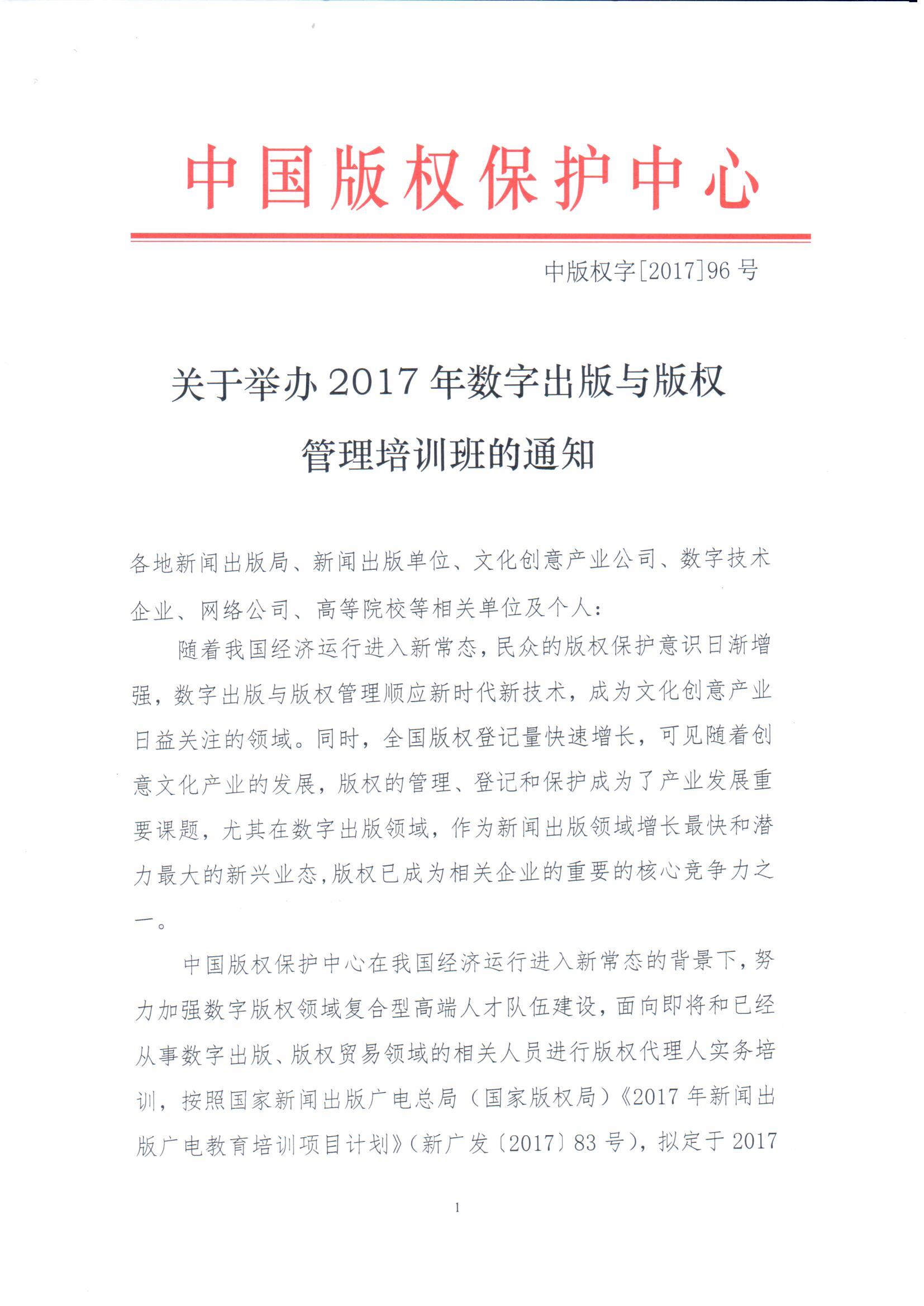 中国版权保护中心在我国经济运行进入新常态的背景下,努力加强数字版权领域复合型高端人才队伍建设,面向即将和已经从事数字出版、版权贸易领域的相关人员进行版权代理人实务培训,按照国家新闻出版广电总局(国家版权局)《2017年新闻出版广电教育培训项目计划》(新广发(2017] 83号),拟定于2017年9月20日至22日在北京举办“2017年数字出版与版权管理培训班”。本次培训班纳入新闻出版广电总局2017年专项业务培训计划,结束后统一发放国家新闻出版广电总局继续教育证书。培训讲授数字出版产品开发及平台搭建的相关专业技术知识、分享数字出版的商业模式和运营经验、介绍当前数字出版的最新趋势与研究、分析数字内容版权保护涉及的法律问题、探讨数字内容的创新应用和商业模式并探寻数字出版业与影视、音乐等行业合作发展的新趋势。