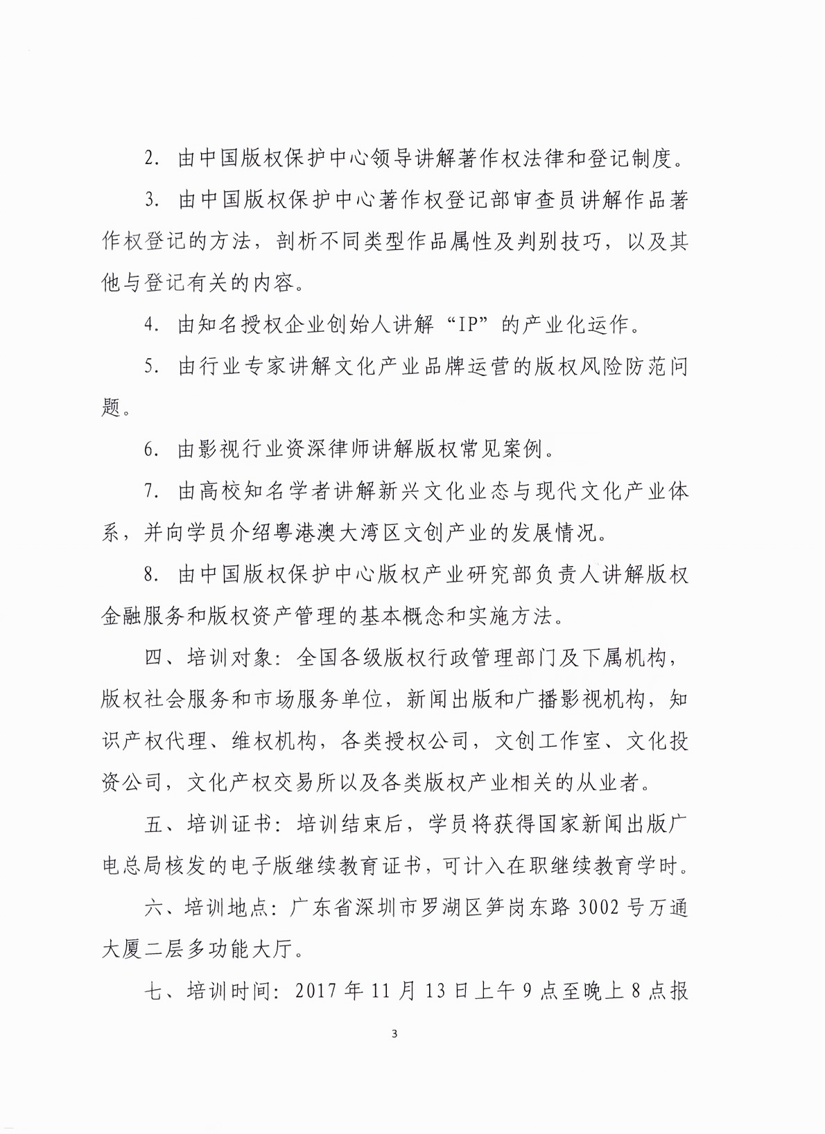 四、培训对象:全国各级版权行政管理部门及下属机构,版权社会服务和市场服务单位,新闻出版和广播影视机构,知识产权代理、维权机构,各类授权公司,文创工作室、文化投资公司,文化产权交易所以及各类版权产业相关的从业者。