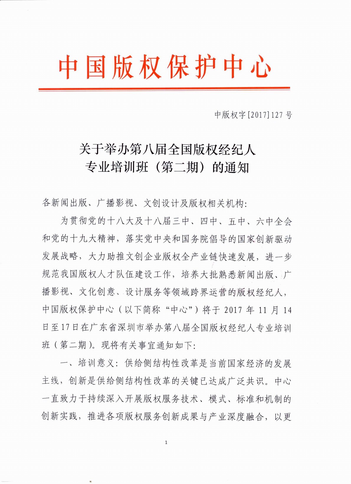 为贯彻党的十八大及十八届三中、四中、五中、六中全会和党的十九大精神,落实党中央和国务院倡导的国家创新驱动发展战略,大力助推文创企业版权全产业链快速发展,进一步规范我国版权人才队伍建设工作,培养大批熟悉新闻出版、广播影视、文化创意、设计服务等领域跨界运营的版权经纪人,中国版权保护中心(以下简称“中心”)将于201 7年11月14日至17日在广东省深圳市举办第八届全国版权经纪人专业培训班(第二期)。现将有关事宜通知如下: